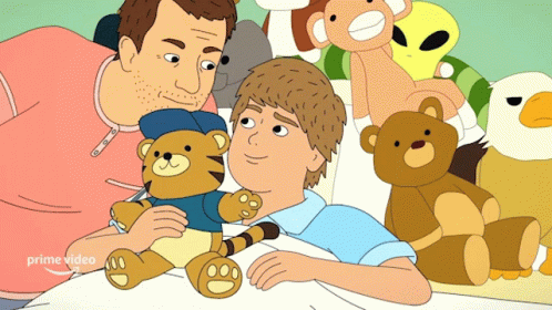 Grant receives a loving kiss from his father, surrounded by plush toys, showcasing sweet fatherly love.
