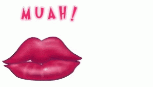 Animated pink lips give a 'muah' kiss, accompanied by a small red heart, expressing affection.
