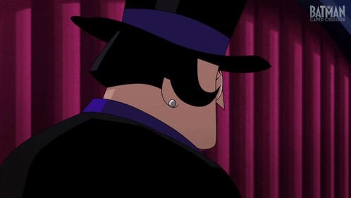 The Penguin from Batman Caped Crusader blows a kiss, exclaiming "MUAH!" in a charming animated moment.