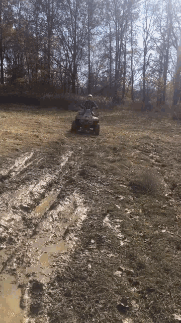 A person on an ATV drives through a deep muddy path, splashing mud everywhere in a wooded area.