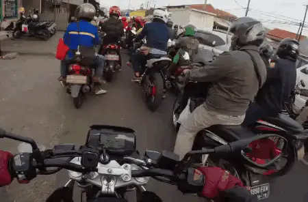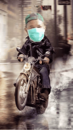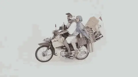 Idhe Novian and Jarot on a motorcycle for Mudik, wearing a mask while riding through water.