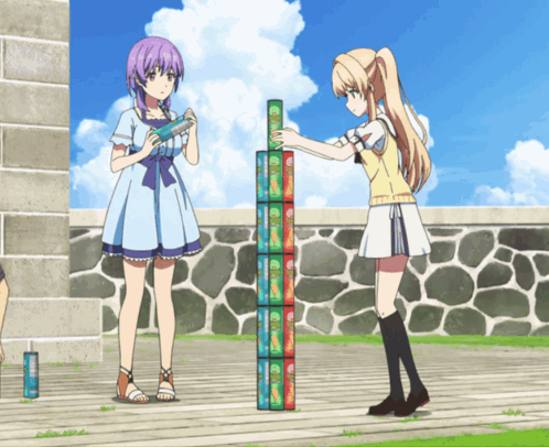 two anime girls are playing a game with a stack of cans that say ' coca cola '
