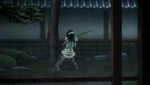 Muichiro Tokito trains intensely with his sword in the rain, practicing his technique in a Japanese garden.