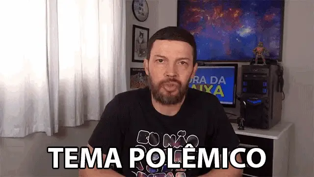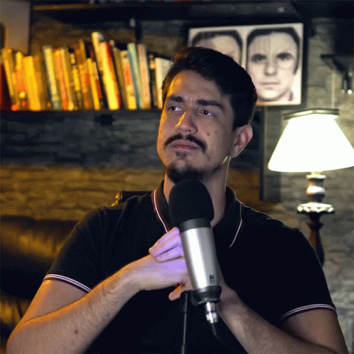 Vitor Santos discusses a controversial topic into a microphone, surrounded by bookshelves and a lamp.