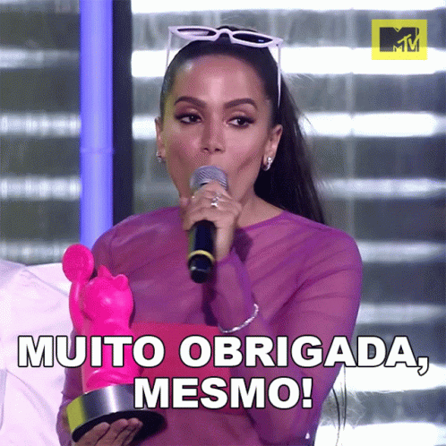 Anitta holding a pink MTV Miaw award, expressing gratitude with 'Muito Obrigada, Mesmo!'