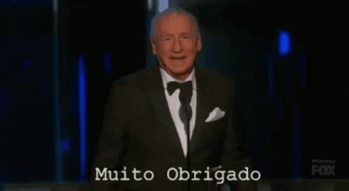Man in tuxedo giving an award speech, saying 'Muito Obrigado' (Thank You Very Much).