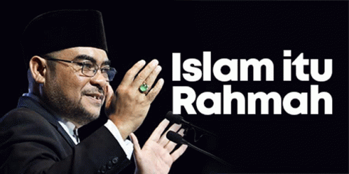 Mujahid Rahmah delivers a speech on Islam's mercy, with the message 'Islam itu Rahmah' displayed.