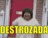 A woman dramatically collapses to the ground in front of a red door, expressing deep distress with the word 'DESTROZADA'.