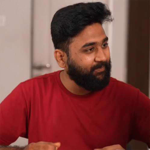 Prashant Kulkarni shrugs with a questioning look, wearing a red shirt and gesturing with his hands.