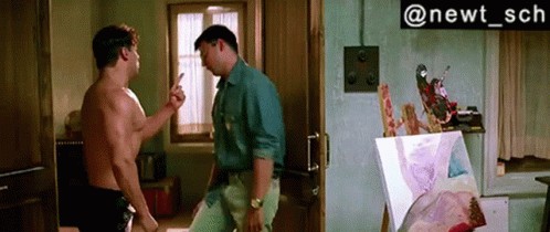 Akshay Kumar and Salman Khan share a playful moment in a scene from the Bollywood movie Mujhse Shaadi Karogi.
