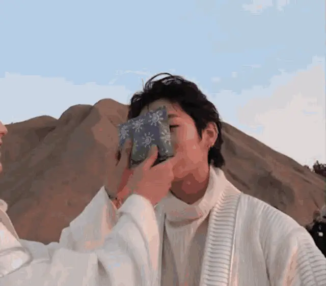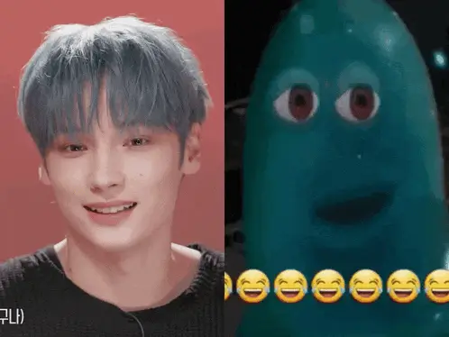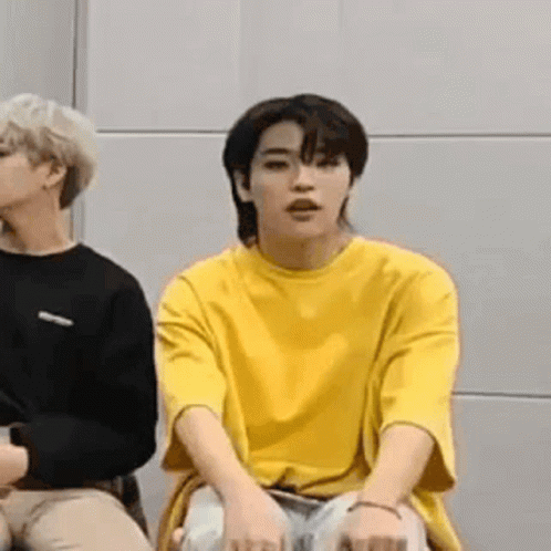 Go Sungho and Mujin making finger hearts, wearing a yellow shirt.