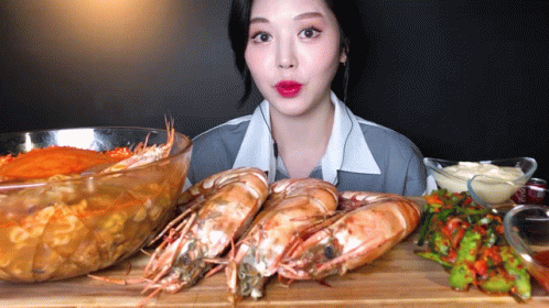 A woman enjoys a mukbang feast with giant shrimp, noodles, and a refreshing Coca-Cola.