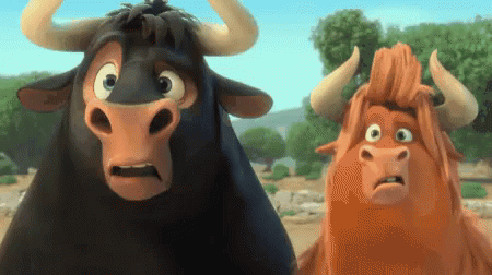 Two cartoon bulls, Ferdinand and a friend with a mohawk, look surprised with the text 'MUKE LOE' overlaid.