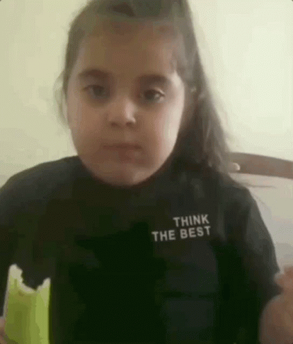 A young girl in a 'THINK THE BEST' shirt makes funny faces as the word 'MÜK' appears on screen.