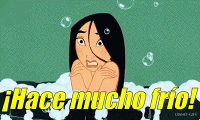 Mulan shivers from the cold while taking a bubble bath, with the Spanish caption '¡Hace mucho frío!' visible.