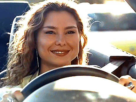 Lavinia Vlasak from Mulheres Apaixonadas smiling while driving a car.