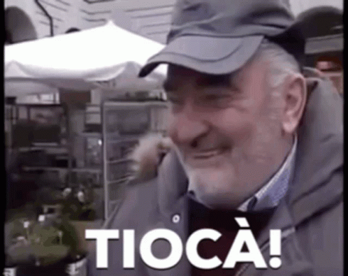Zanonato, a man in a hat, smiles and exclaims "Tiocà!" in a Venetian dialect, related to a fine for drug use.