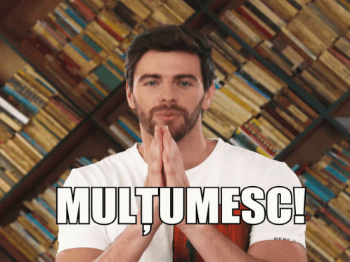 A man expresses gratitude with folded hands in front of a bookshelf, saying 'Mulțumesc!' (Thank You!).