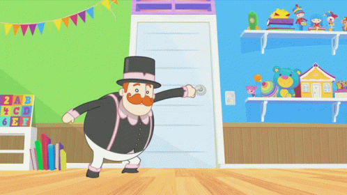 Bita, Dan, Fred, Guto, Lila, and Tito joyfully run through an open door in their colorful world.