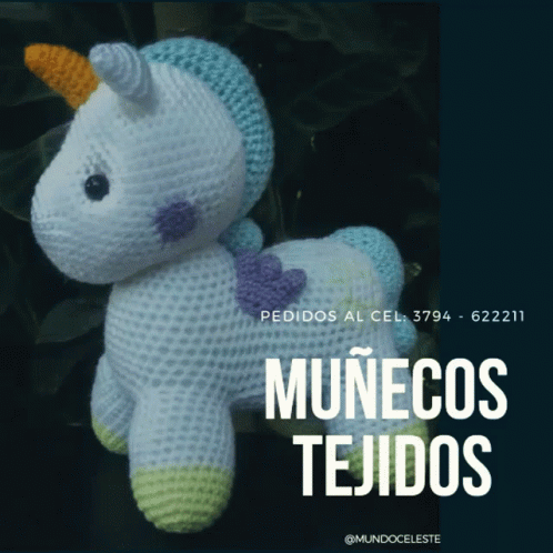 A beautifully crocheted unicorn doll from Mundoceleste, advertising 'Muñecos Tejidos' (Crochet Dolls).