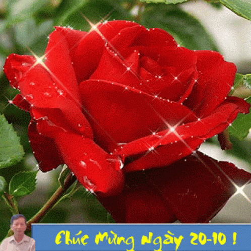 A vibrant red rose with green leaves and a blue banner celebrating Mung Ngay Phu Nu (Vietnamese Women's Day) on October 20th.