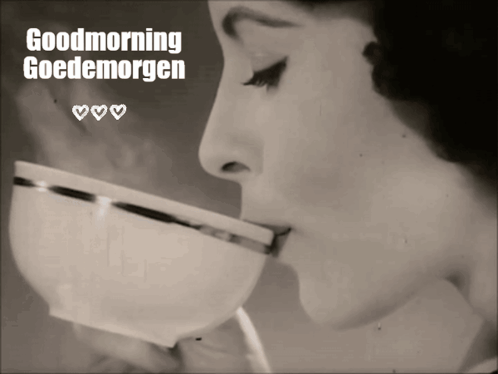 A woman enjoys a warm drink in this vintage Mupke's Plaatjes Allerlei good morning greeting.