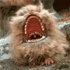 A furry, brown, Muppet-like creature with a wide-open mouth, showing its red interior and teeth.