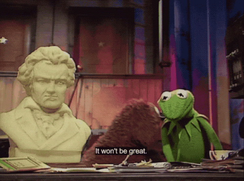 Kermit The Frog sits next to a Beethoven bust, expressing a negative sentiment with the caption 'It won't be great.'