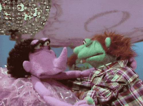 Two Muppet Show characters, a purple rhinoceros in a tutu and a green puppet in plaid, dance closely in a ballroom setting.