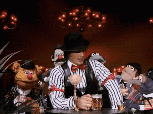 Sylvester Stallone, wearing a top hat and striped shirt, sits at a bar surrounded by Muppets from The Muppet Show.