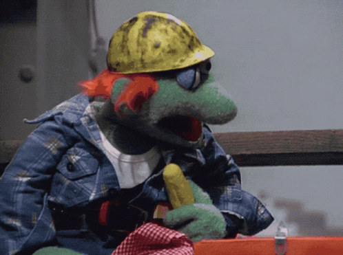 A Muppet Show construction worker, looking surprised, holds a banana.