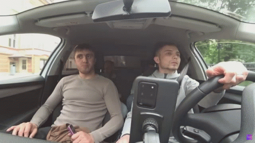 Murad and a friend share a lively conversation while driving in a car, captured from the dashboard.