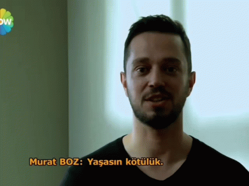 Turkish celebrity Murat Boz speaks and smiles, uttering the phrase 'Yaşasın kötülük' (Long live evil).