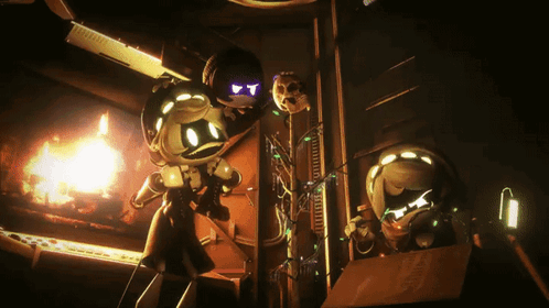 Uzi, N, and V from Murder Drones stand in a dark, industrial room with a fire burning in the background.