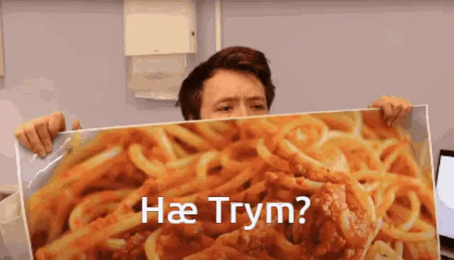 Murdrocks Johannes Nikolai Aas reacts with a surprised expression while holding a large picture of spaghetti.