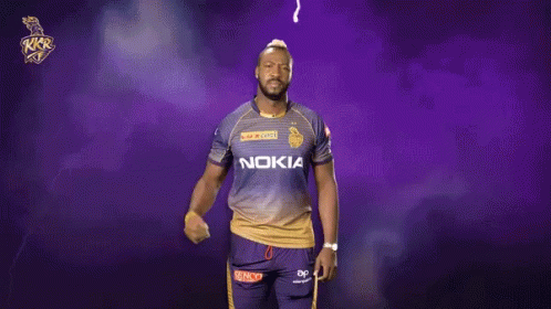 Andre Russell, wearing his KKR jersey, shows off his powerful physique by flexing his arm against a purple background.