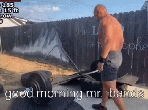 Muscular Guy Gujum performs outdoor weightlifting, greeted by the caption 'good morning mr. bands'.