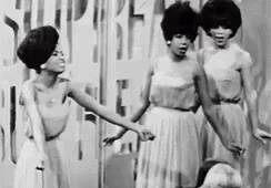 Three women with bouffant hairstyles perform on stage in a vintage black and white clip, singing and moving in sync.