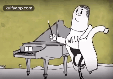 An animated cartoon character joyfully dances and then plays a grand piano, fully immersed in music mode.