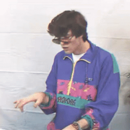 Simon de Wit (Musicbyblanks) vibing to 80s music, playing an invisible keyboard in a retro jacket.