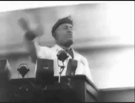 Benito Mussolini delivering a passionate speech from a podium, gesturing emphatically in this historical black and white footage.