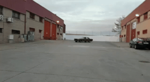 A classic olive green 1966 Ford Mustang V8 drives slowly through an industrial area.
