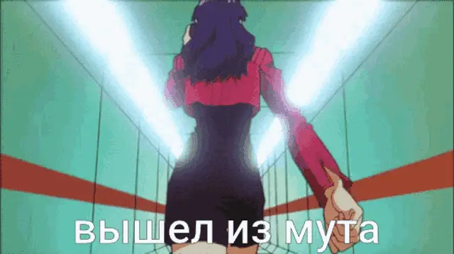 Woman in turtleneck reacts to being muted for 3 days because of a GIF, with Russian captions explaining the situation.