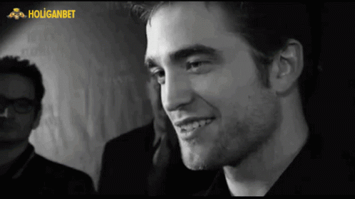 Robert Pattinson smiles happily in a black and white clip, with a Holiganbet logo visible.