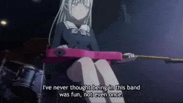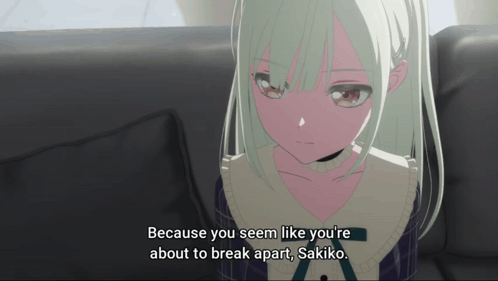 a girl with white hair is sitting on a couch and says because you seem like you 're about to break apart sakiko