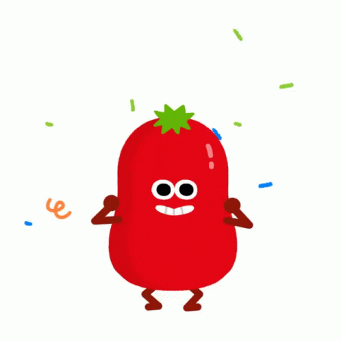 Mutti Pomodoro, a happy animated tomato character, jumps with joy as confetti falls around it.