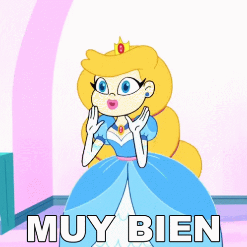 Cartoon princess from Las Chicas Superpoderosas reacts with 'Muy Bien' (Very Good) expression.