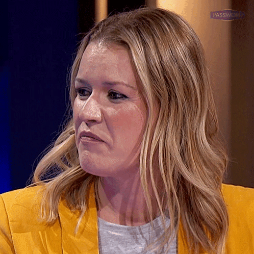 A woman with blonde hair and a yellow jacket reacts during a game of Password, showing a thoughtful expression.