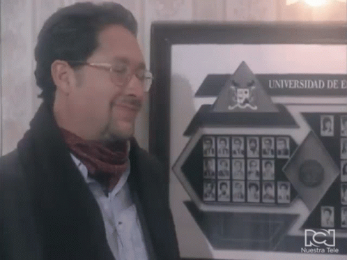 A man from Yo Soy Betty La Fea says 'Muy Bonita' while standing by a university board.