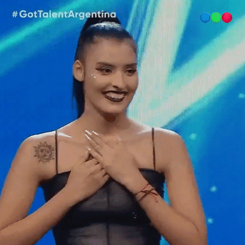 A young woman on Got Talent Argentina becomes overwhelmed with emotion, smiling and covering her face.